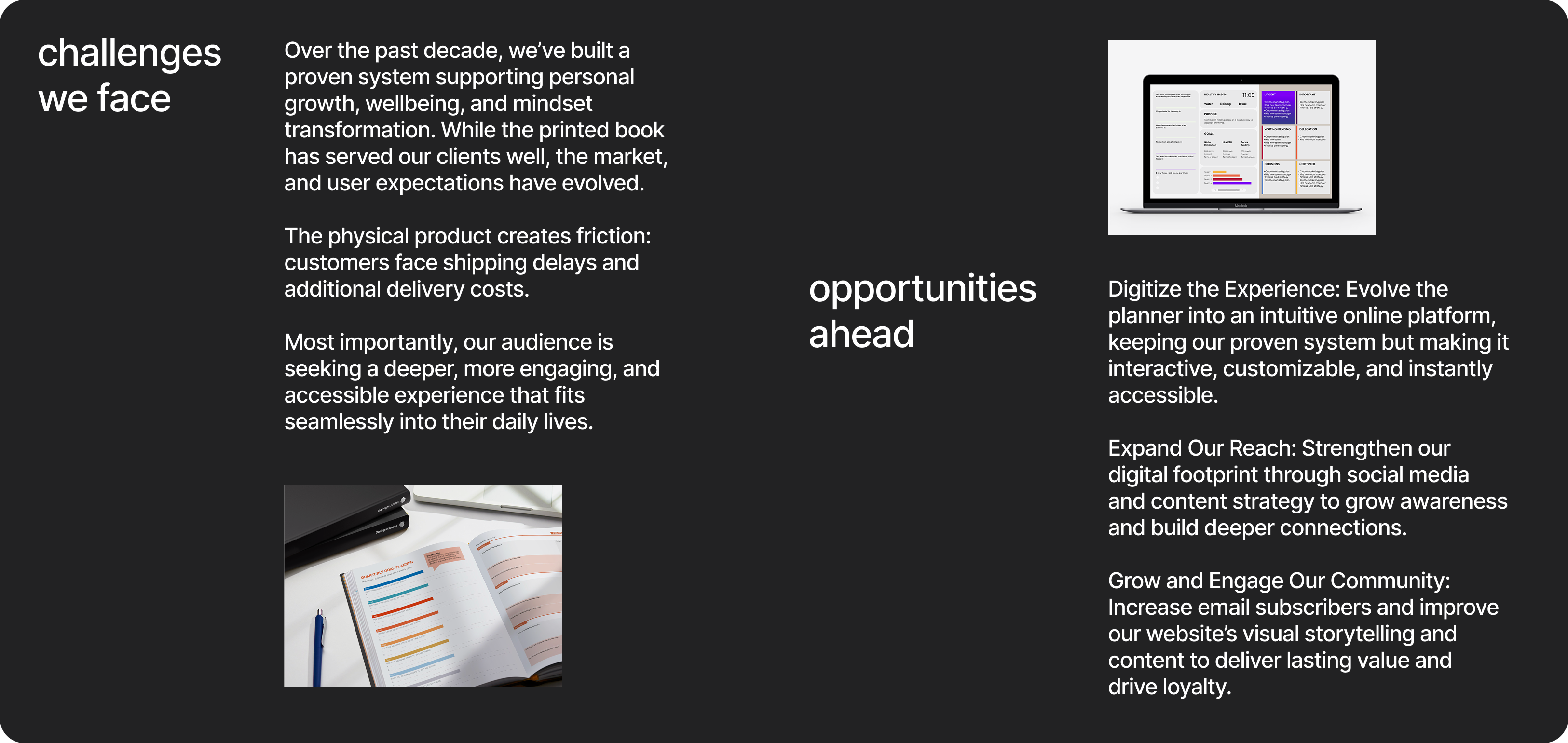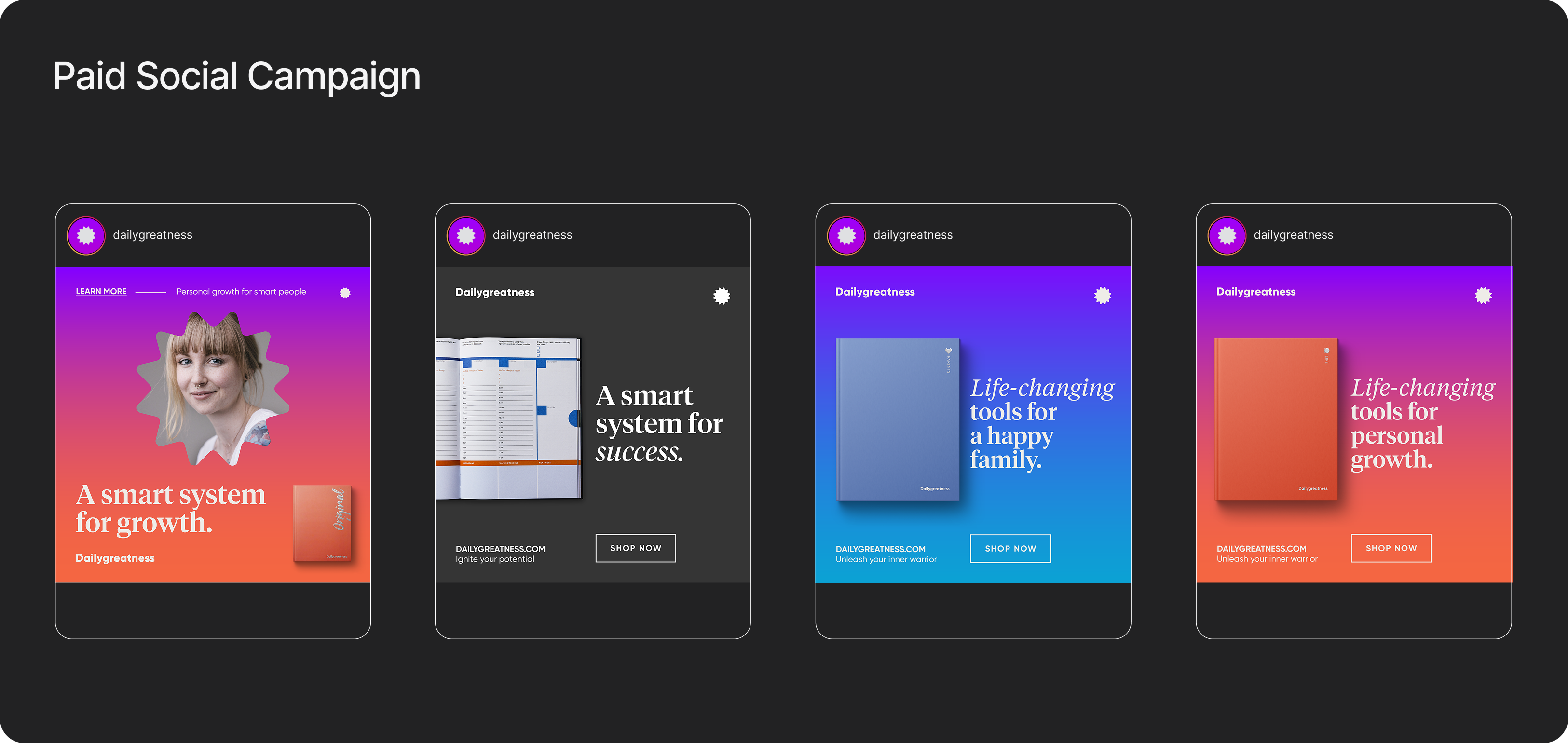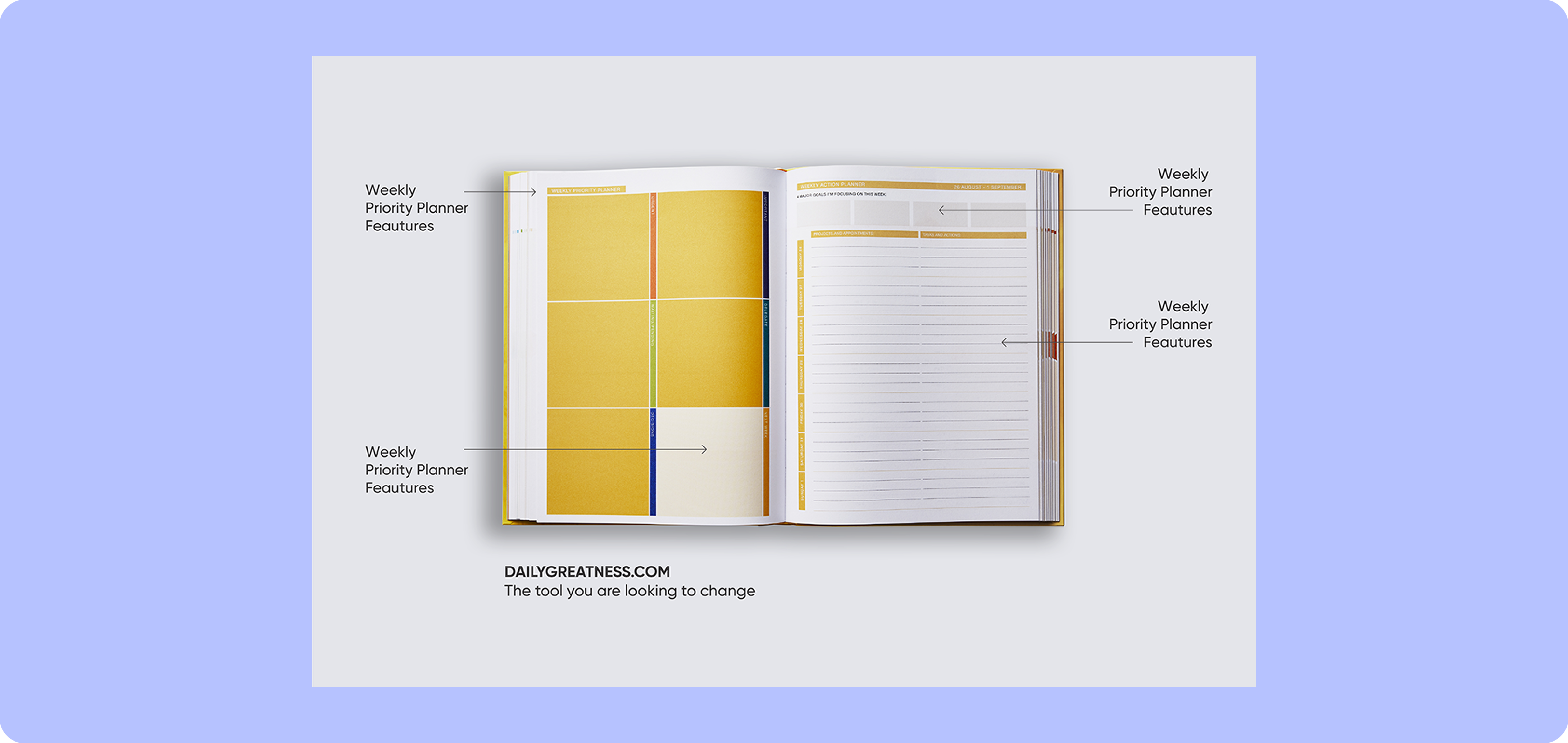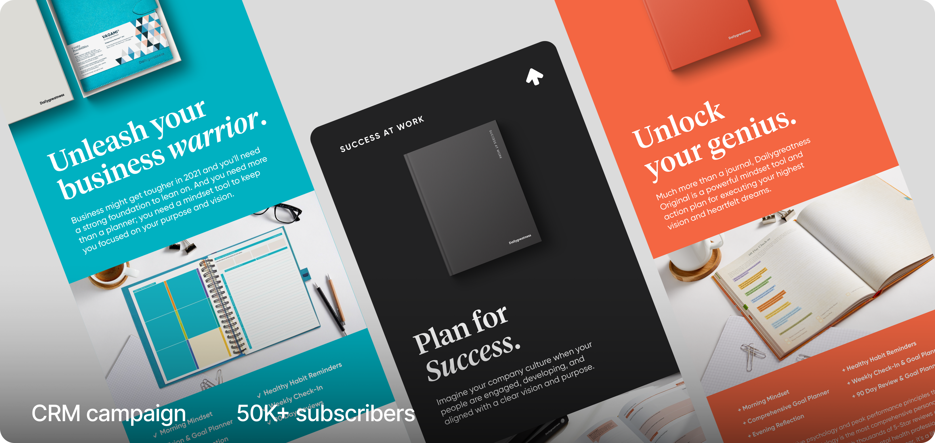 For over a decade, I led the creative and brand evolution of Dailygreatness, a globally recognized personal growth platform offering tools for mindset, wellbeing, and productivity. What started as a single printed planner grew into a category-defining brand with a global community of over 250,000 customers in 30+ countries. I guided the brand through product design, digital transformation.